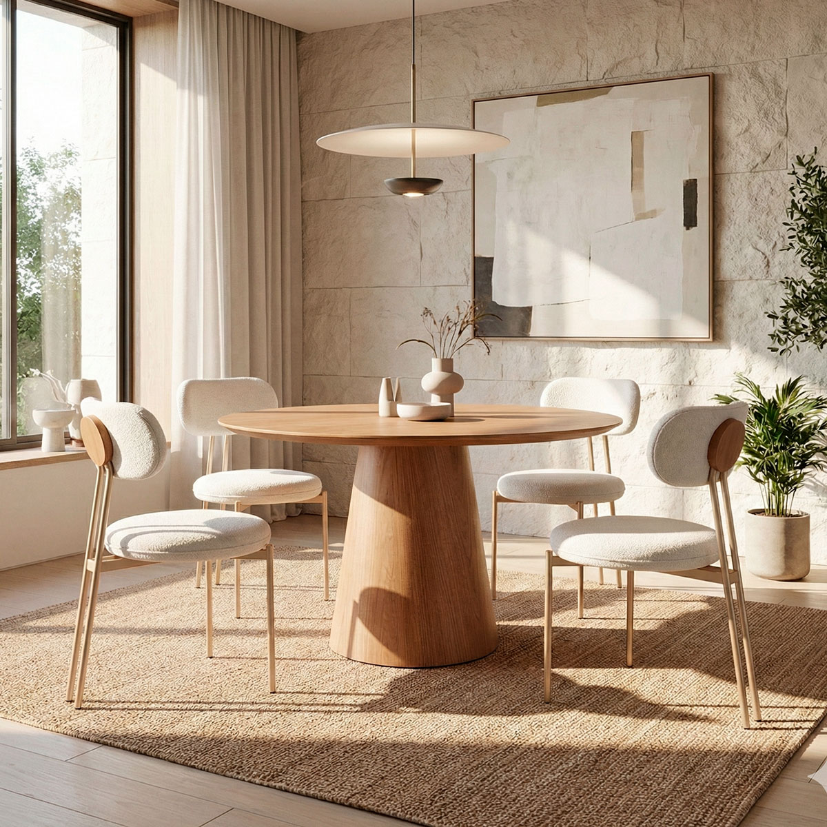A Cadeira Serena é um convite ao sentar. Seu assento e encosto arredondados são revestidos em tecido bouclé médio, uma tendência absoluta na alta decoração, que oferece uma textura tátil rica, visual sofisticado e um toque extremamente acolhedor.